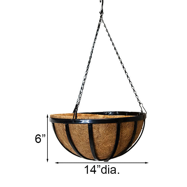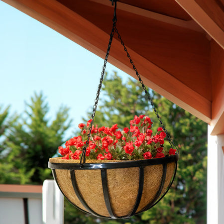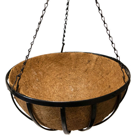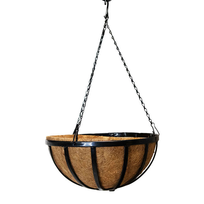 Add a place for greenery to your yard or porch with ease using this Gardman Forge Hanging Basket with Coco Liner. This steadfast, classic hanging basket lends traditional styling to your area in moments, while providing plenty of space for a vine or a few herbs. A 14" diameter, steel ring supports several arched slats that curve downward and attach to a base disc, creating a familiar basket shape. The black, PVC coating protects the steel from elemental wear, and an included coco liner completes the piece. This liner makes it easy to plant inside the frame, and can be removed or replaced at the end of the season to keep the basket in great working order. A top "S" hook connected to triple, 17" long chains makes it simple to hang the planter, and the black and brown tones contrast your herbs or flowering plant for an alluring garden accent. Make your front porch or garden a bit livelier by showcasing flowers in this Forged Hanging Basket with Coco Liner.