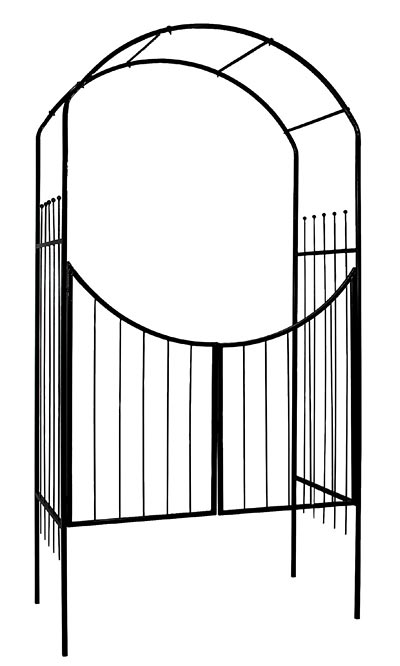 Create a grand, antebellum entry into your garden using this Gardman Black Savannah Arch and Gate by Harbor Gardens. Using an arbor in your yard wonderfully brings height to the area, and this gated piece perfectly defines an entryway. The softly rounded top of this structure offers a timeless shape, enhanced by the gentle, downward curve of the gate panels. This forms a striking, circular opening, contrasting the square, metal bar construction. Round, vertical rods within the gate and the side panels lend further detail to this arch, and orbs atop each side rod add a bit of whimsy. A small latch at the top of the gate helps keep it closed, and lifts easily for access to your outdoor retreat. Cross beams on the top arch keep it plumb and sturdy, and the black, epoxy coating protects the piece from weather. Included anchors insert into the legs, keeping the item stable in your garden soil, and the significant size of this arch easily spans a walkway. Define an entrance to your back yard or home with this Black Savannah Arch and Gate by Harbor Gardens. Assembly required.