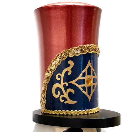 - Soldier statue sports an ornate, maroon and navy uniform with plenty of scrollwork and a tall hat.