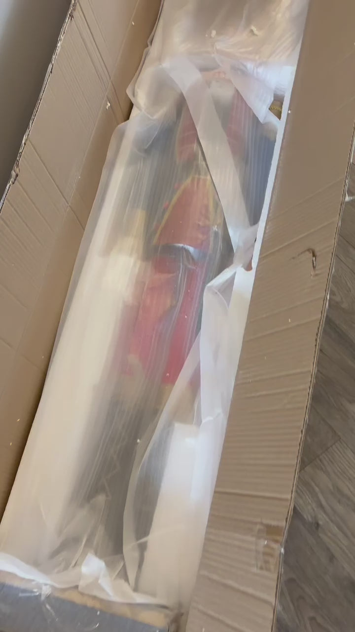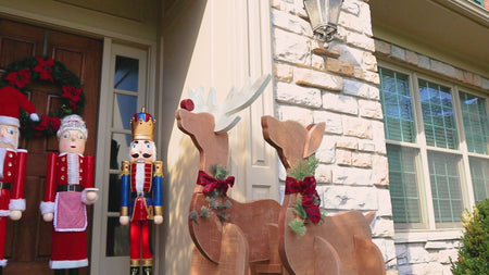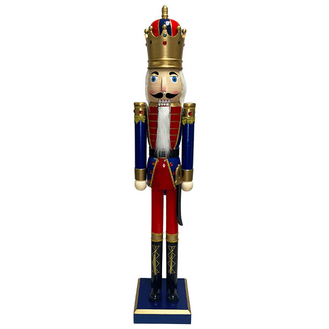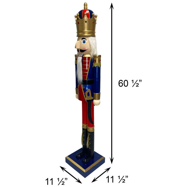 Adorn your covered porch and defend your home from the Mouse King this holiday season by placing this GIANT Nutcracker King Statue by Prime Retreat on it. This 60.5" wooden sculpture is designed in the likeness of the traditional holiday favorite, creating a striking and familiar attraction for your home. This Nutcracker King wears a classic painted face featuring a protruding curved nose and a functioning mouth with a white colored faux beard hanging from it. The king's head is completed by white colored faux hair around his head hanging from underneath a majestic, gold colored crown topped with a red, blue, and gold striped dome and gold top. The nutcracker's sculpted and painted red and blue colored uniform is trimmed with plastic gold colored ric-rac and painted gold cuffs, making for an ornate design, while also being decorated in plastic, red colored jewels, creating the appearance of royalty. A painted black belt with gold colored buckle encompasses his waist, matching the painted high boots adorned with gold colored, fabric tassels and painted laces, lending a distinguished look to the attire. Hanging from the bottom of the coat is a wood imitation sheathed saber painted black with a gold handle, rounding out the appearance of this nutcracker's fictional obligation while decorating your home for the season. Supporting this lively and artisanal, 57.5" tall wooden statue is a 3" tall, blue and gold colored base matching the Nutcracker King's uniform for a consistent appearance, and its 11.5" x 11.5" size makes for stability of the robust, hand crafted sculpture when placed on a flat and level surface. Welcome adoring eyes while warding off any nefarious wintertime characters using this GIANT Nutcracker King Statue by Prime Retreat.