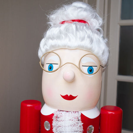 - Mrs. Claus' white hair, gold rimmed spectacles, and welcoming smile lend a friendly effect.