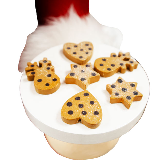 - Her left hand holds a plate of chocolate chip cookies, each in a whimsical holiday shape.