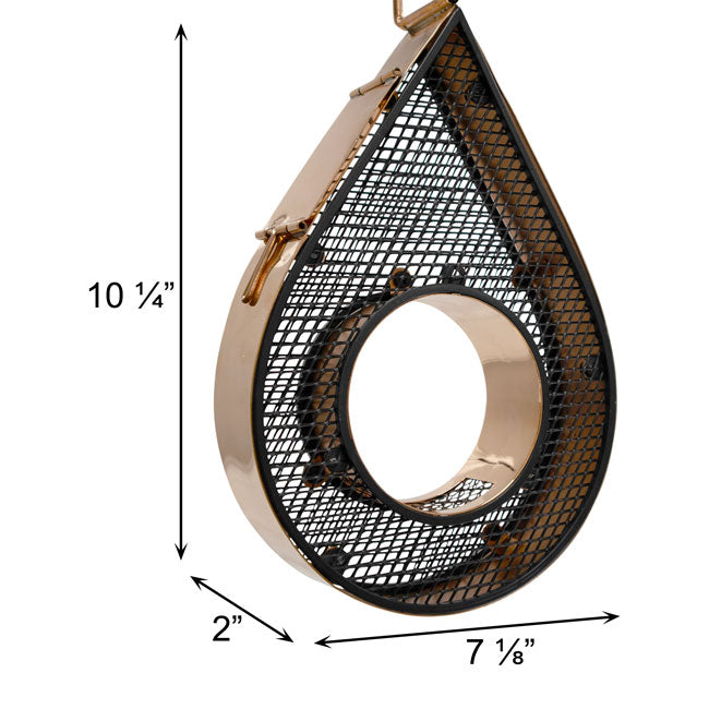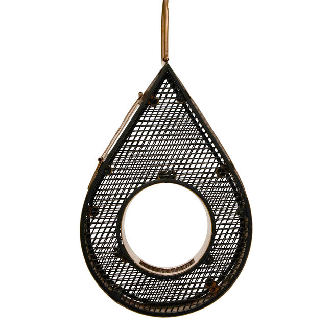 - Wire mesh panel on each side of the raindrop-inspired feeder encloses the generous seed offering