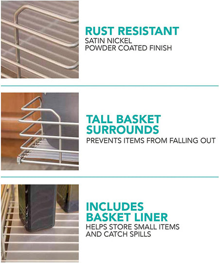 Increase the storage options in your medium to large cabinet using this Grayline by Panacea 2-Tier Slide Out Basket for 15" Wide Cabinets. These 2 baskets snap securely into the included frame, transforming an open cabinet into fantastic and convenient storage. The steel, dual level rail assembly installs into a 15" wide and 21" deep cabinet easily, and perfectly supports the 2 included baskets. Hidden bearings in these horizontal rails provide smooth movement, for you to pull the container outward and reach your skillet or pot in moments. A bespoke, powder coated, satin nickel finish throughout the unit wonderfully enhances your kitchen area, and protects the piece from rusting. Included plastic liners cover the base of each basket, supporting smaller items, and the extended sides keep bowls and dishes nicely in place. The top basket measures 5.75" tall for smaller saucepans, and you can place it 5.5", 7.25", or 8.75" above the lower shelf to best suit your needs. Each slides independently for quick access, and the open frame keeps everything on them visible at a glance. The steel construction acts as another kitchen workhorse, while the item is perfectly sized for traditional cabinets. Have an organized cooking area with help from this 2-Tier Slide Out Basket for 15" Wide Cabinets. Assembly required.