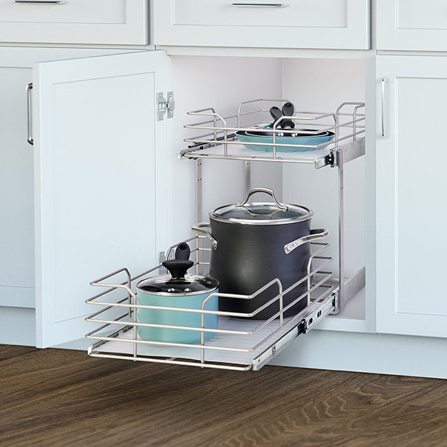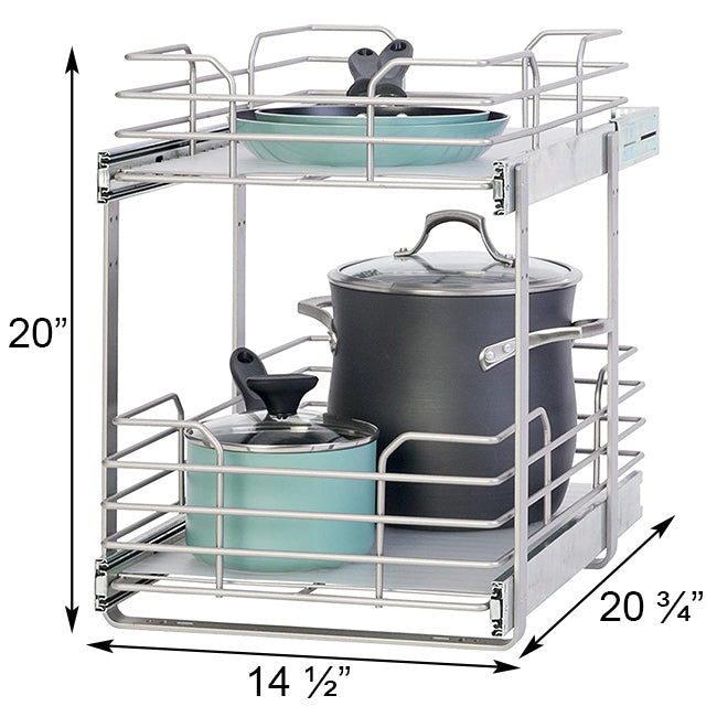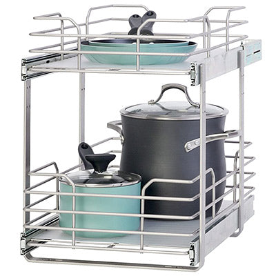 Note: This description refers only to the Grayline by Panacea 2-Tier Slide Out Basket for 15" Wide Cabinets. The cookware shown is not included.