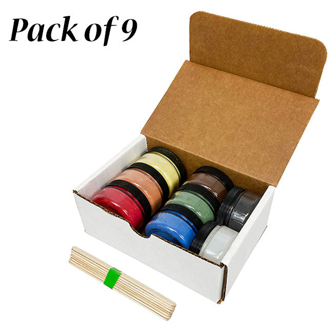 - 9 boxes, each containing 8 jars of powdered pigments and stirring sticks, make a great addition to a local crafting store