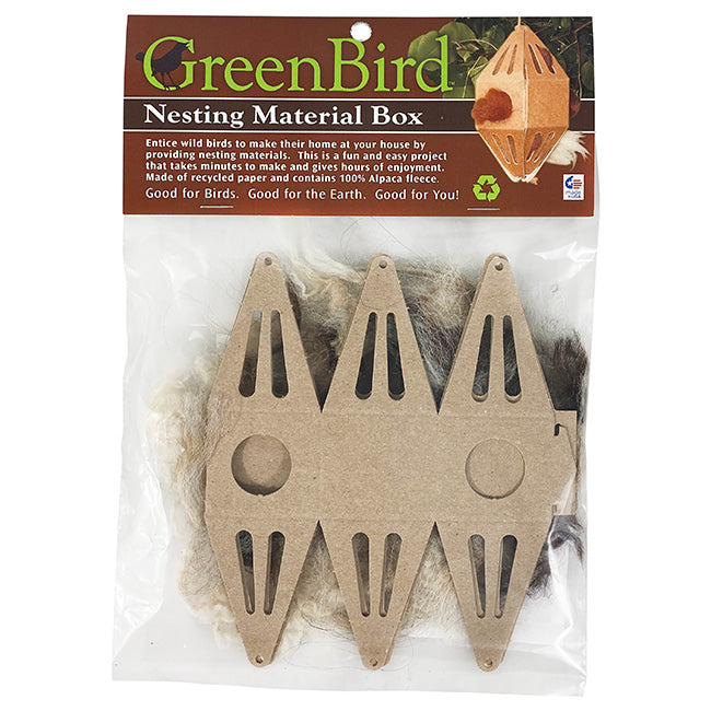 Nesting Material Package Contents: 1 folded nesting material holder, 1 cord, alpaca fleece each