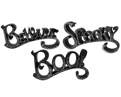 Turn a few bookshelves in your home into a seasonal showcase using these Halloween Resin Shelf Messages. This set of three durable, Halloween-inspired words is perfect for accenting shelves, while highlighting your favorite holiday in moments. One unit reads "Beware," while another says "Spooky" in light script. The third piece reads "Boo!", and the resin construction makes the hardy phrases simple to place on a level surface. A silver glitter on the front of each brightly contrasts the black base hue, and keeps the pieces both readable and visible all season. Rest these items together on an entryway table for your costume party, or spread them throughout a room for a cohesive effect. Cleverly turn your shelves from functional to decorative every fall with these premium Halloween Resin Shelf Messages.