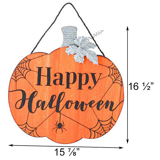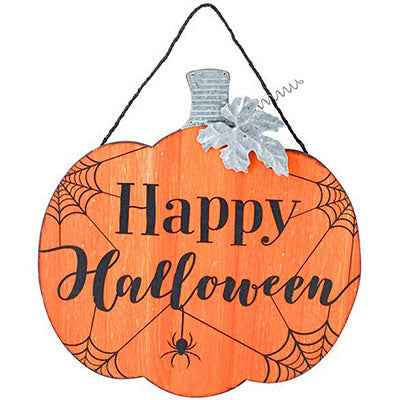 Celebrate your favorite holiday season on your wall year after year using this Orange Happy Halloween Wooden Pumpkin Wall Art. Adding this familiar shape to your door or wall ushers in an autumnal look with ease, furthered by the orange finish. The phrase "Happy Halloween" adorns the center of the hardy piece, with cobweb shapes and a spider silhouette in black enhancing the motif. A three-dimensional leaf and spiraling vine, along with a corrugated tin covering on the stem, offer a bit of contrast, and a fabric cord makes it simple to hang the unit. Its wooden body adds durability, perfect for many seasons of use, and the orange and black tones highlight the holiday. Showcase several familiar Halloween elements against a wall with this Orange Happy Halloween Wooden Pumpkin Wall Art.