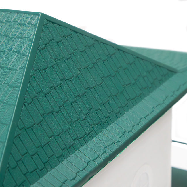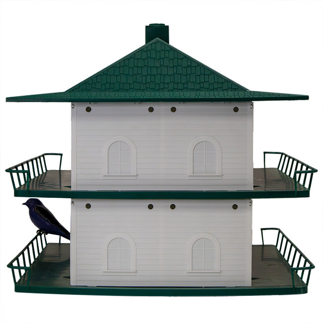 Turn a bit of your backyard into a purple martin roosting spot using this Heath 12-Room Two-Story Purple Martin House with Book and Decoys. These wonderful birds are dependent upon manmade housing, and this package provides them a convenient and inviting shelter. The Heath 12-Room Two-Story Purple Martin House is a fantastic home for any beginning landlord, thanks to its all-plastic body and snap assembly. Each floor has 6 individual apartments, measuring 5.75" long and 5.75" wide, and the 2.125" diameter entry for each apartment allows martins to easily access it. The white color of the home aids in keeping the item at just the right temperature, and small holes along the top of each floor offer ventilation. The deep green color of the roof, chimney, and bases lend striking contrast to the item, and perches sit in front of each opening for convenient landing spots. These perches also create excellent spots to place the two included Heath Deluxe Purple Martin Decoys, for better attracting these birds. Slide your existing 1.25" outer diameter pole (not included) through the house to ensure it remains strong and stable, and place the pole at a 12' to 15' height to best attract martins. Invite martins to start colonizing in your yard with this Heath 12-Room Two-Story Purple Martin House with Decoys. House made in the USA.