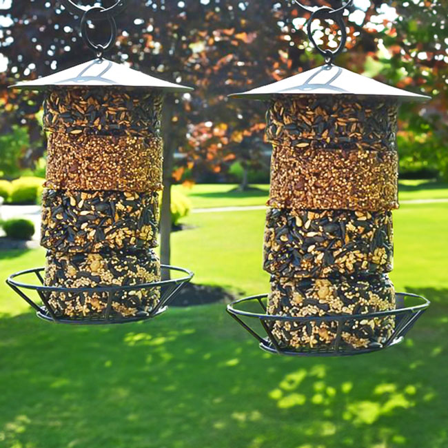 - Set of 2 durable, steel feeders designed to hold formed, circular seed cakes