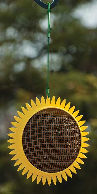 Add a bright look to your backyard bird sanctuary with this Heritage Farms Hanging Sunflower Seed Bird Feeder. A vivid yellow frame, brown mesh center, and green hanger create a fun and recognizable sunflower, adding a whimsical look to your garden in moments. The center of the flower accommodates 1.5 quarts of peanut splits or sunflower seed easily, and its 0.25" square mesh allows birds to cling and dine. Six drainage holes on the base of the item help prevent seed from becoming waterlogged, and a green, plastic coated cable makes it simple to hang the unit. A section of the back of the feeder opens for cleaning and refilling, while the wealth of petal shapes on the frame enhances the familiar motif. Crafted from steel, this piece provides plenty of durability, and its yellow and brown tones lend a bold hint to the yard. Celebrate flowers and color in your yard using this Hanging Sunflower Seed Bird Feeder.