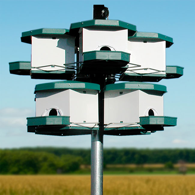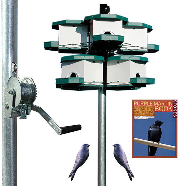The Heritage Farms Quad Pod Purple Martin House Package includes everything you need to bring purple martins into your backyard birding sanctuary. After you finish assembling 2 levels of the rigorously tested Heritage Farms Quad Pod Purple Martin House, mount them on the included Quad Pod Pole System, and attach the 2 included Purple Martin Decoys to start attracting these birds right away. Once your new system is complete, the included Stokes Purple Martin Book will offer all the information you need to attract, house, and care for a colony of purple martins in your own backyard. The included Stokes Guide serves as the perfect reference book for the beginning to experienced purple martin enthusiast. This package is ideal for anyone just getting started with purple martins and is a great gift idea.