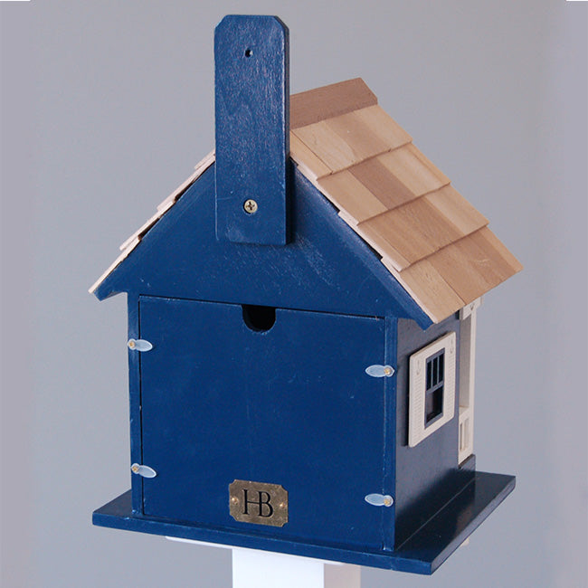 Mesh nautical and natural elements in your bird garden with this Home Bazaar Navy Anchor Cottage Bird House. The charming, decorative pieces on this unit showcase your love of boating, perfectly enhanced by the navy and white color scheme. Three faux windows, a front door, and a porch rail add realism, while wooden shingles cover the pitched roof. Several anchor cut outs on the trim and shutters, followed by one on the front door, easily capture attention, and a 1.25" diameter entry hole sports a white arc above it for added style. This allows small songbirds to enter the unit, and the generous interior provides plenty of nesting area. Drainage holes on the level base help any captured water exit the nest, and gaps beneath the roof overhang offer ventilation. A bit of screening on the interior of the shelter creates a ladder, for fledglings to reach the exit, and a ledge below the entry hole offers a bit of interior perching room. The back panel removes for nest checks and cleaning, and a hanging tab extends upward for placement against a post or wall. Rest the base of this roost on a table or other level surface for a different look. The navy and white paint lend traditional tones to your garden, while the anchor figures provide a recognizable theme. Solidify your love of boating by adding this Navy Anchor Cottage Bird House to your yard.