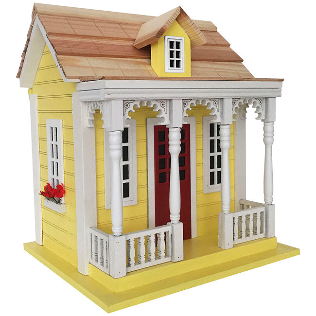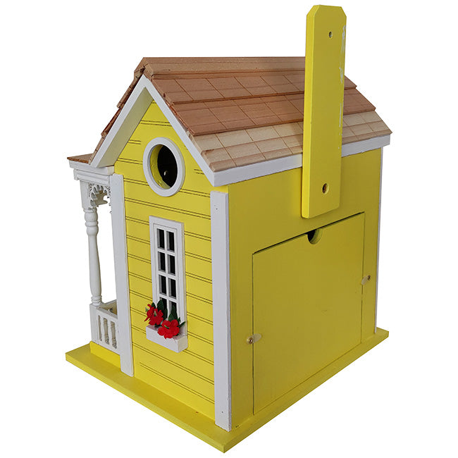 Infuse your yard with a touch of the northeast coast using the Home Bazaar Yellow Bristol Cottage Bird House. Yellow and red hues are accented by white trim and an unfinished, wood roof, reminiscent of coastal, New England homes. Painted white railings and columns on the home's front porch support its roof and are adorned with decorative woodwork, making for an attention grabbing piece. The shingled flat roof above the porch becomes a gabled roof with a dormer on its front side, which features one of the five windows present on the house. Two windows below complement the red imitation door, while one on each side of the house contains imitation flower boxes holding faux red flowers. A 1.25" diameter entrance for your feathered friends rests below the roof line on one side of the shelter, and a signifcant panel on the rear removes for cleaning and nest checks. A mesh ladder inside the large chamber helps fledglings climb upward and leave the roost. A single hole in the center of the base assists with drainage of accumulating moisture inside the home, while three holes just beneath the porch roof allow for adequate ventilation and a comfortable nesting destination. The house can be mounted against a wall or post using the 5.75" long, dog-eared plank that swivels upward, or may be attached to a mounting plate (not included) for placement atop a pole or post. Offer your local birds a taste of coastal living with this Yellow Bristol Cottage Bird House.