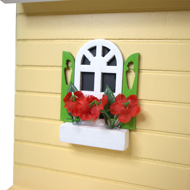 - Red, fabric flowers further enhance the white, green, and yellow home, topped by a pitched and lapped, wooden roof