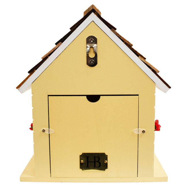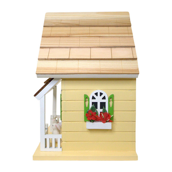 - Compact, all wood bird shelter with soft yellow tones and colorful accents brings a fun look to any garden