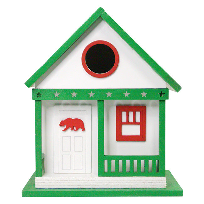 Combine striking tones and classic design with state pride while drawing birds to the garden with this Home Bazaar California State Cottage Bird House. This home sports charming and recognizable decoration, bringing to mind the great state of California, with red and green coloration providing fantastic contrast to the white tone of the house's body. The familiar impression of a California flag appears on either side of the shelter's pitched roof, while green trim lends vibrant allure to the porch railing, base, and awning for additional embellishment. Three faux windows, a front door, and the detailed railing add to the cottage's realism as the state flag design creates a dazzling focal point in your backyard sanctuary. Star-shaped cut outs accentuate the green trim, while red shutters are situated along the side panels for extra detail. A red bear figure rests on the front door, with the same red hue also bordering the 1.25" diameter entry hole to tie together the state motif. Songbirds will find easy access through this entry, and the generous interior provides ample nesting space for a cozy and comfortable roost. A small hole on the level base allows for drainage of accumulated moisture, while gaps beneath the roof overhang help facilitate ventilation for a clean and fresh interior. This hardy unit's back panel removes with ease for nest checks and cleanings, and a metal bracket allows you to place the shelter against a post or wall for a great showcase. The green, white, and red hues bring pleasing tones to the garden as you beckon feathered friends to this unique and charming shelter. Highlight your love of the Golden State and attract a plethora of songbirds to the garden with this California State Cottage Bird House.