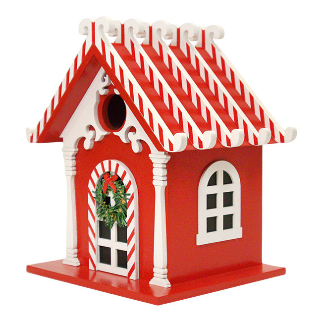 Refresh your bird garden for the winter season with this stunning, unique Home Bazaar Candy Cane Bird House. The bright red color offset by white trim and faux columns adds a spirited look to any setting, for a truly versatile and one-of-a-kind holiday accent. Angled, red stripes on the white, exterior roof rafters and door arch evoke familiar peppermint candy, and a faux fabric wreath on the front door completes the winter motif. Abundant scrolls and column figures also adorn this front panel, surrounding the 1.25" diameter entry hole. This leads to a spacious nesting chamber, perfect for chickadees, wrens, and other small cavity nesting birds. The back panel removes for regular nest checks and maintenance, while a line of screening below the entry forms a ladder for fledglings to reach the aperture when ready to exit. A hole on the base of the nest box allows for water drainage, and the wooden construction forms a classic shelter. Consistent and vivid detailing on the home is sure to capture the attention of many garden visitors, and a back tab swings upward for showcasing the item against a wall or post. Its flat base also accommodates small mounting plates for display on a pole. The red paint offers brightness to the piece, and the wooden frame is well suited for both indoor and outdoor use. Enliven your home or garden with essential holiday charm using this Candy Cane Bird House.