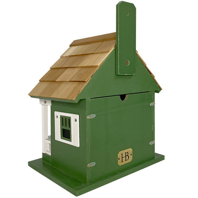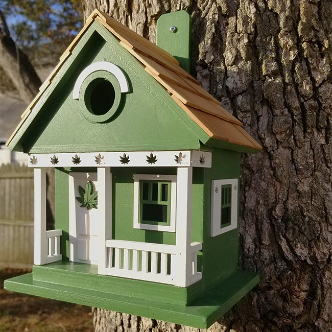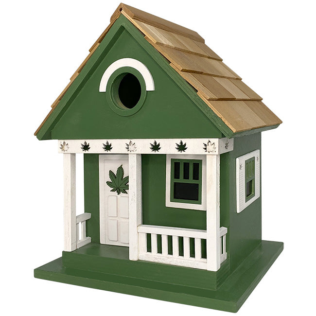 Invite local birds to nest in high style with this Home Bazaar Cannabis Cottage Bird House. This house is painted a leafy green with white trim budding against it throughout for striking contrast. Its front porch is accompanied by a picket railing and the fascia above is patterned with cannabis leaf motifs, which are continued onto the shutters of the windows on both sides of the joint. The front door features a large, detailed cannabis leaf ornament, while the home's 1.25" entrance is great for small birds passing through, and completed with a semi-circular piece of trim. A wood shingled, gable roof crowns the house, offering an appropriately natural aesthetic to the piece, while a swiveling plank affixed to the rear of the home makes for straightforward mounting to a wall or post. Two holes in the base of the structure allow for adequate drainage of any accumulating moisture, and gaps along the underside of the roof overhangs aerate the interior, making for a comfortable roost. A 5.75" x 5" panel on the backside of the home is removable for straightforward access and cleaning, and also exposes a mesh ladder ascending to a gable loft with the entrance above the home's front porch. Elevate the nesting options for your backyard birds with this Cannabis Cottage Bird House.