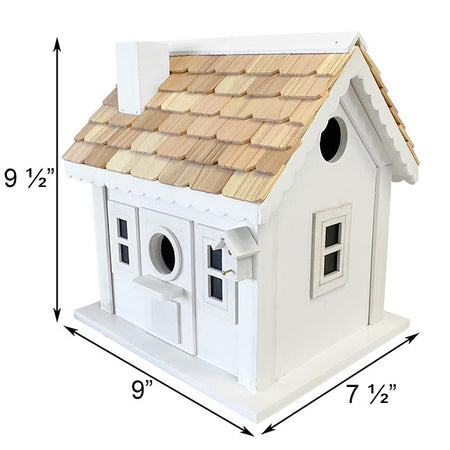 Offer birds an adorable resting spot by adding this Home Bazaar Charmer Condo Bird House to your yard. The vivid white color and amazing architectural detailing bring wonderful style and realism to your bird garden, while creating a working nest box. Tan hues throughout the pitched, shingled roof contrast the painted white body, and a flat base easily supports the unit. Black paint within the faux window shapes further the realistic look, completed by a scalloped roof edge and tiny wooden bird house. A front, 1.25" diameter entry hole sits between the window shapes, and a small ledge below it provides extra landing area. Another 1.25" diameter entry rests on one side of the shelter, and the roof overhangs each to protect the unpainted interior from the elements. Hidden holes on the back panel help ventilate the domicile, and the wooden body and white tone prevent nestlings from overheating. Additional holes on the base provide drainage, and one side panel fully removes for nest checks. Attach a mounting plate (not included) to the base of the home for displaying it on a post or pole easily. The wooden body and white color bring a striking look to your garden, lending a touch of manmade style to the setting. Welcome birds into your backyard with this Charmer Condo Bird House.