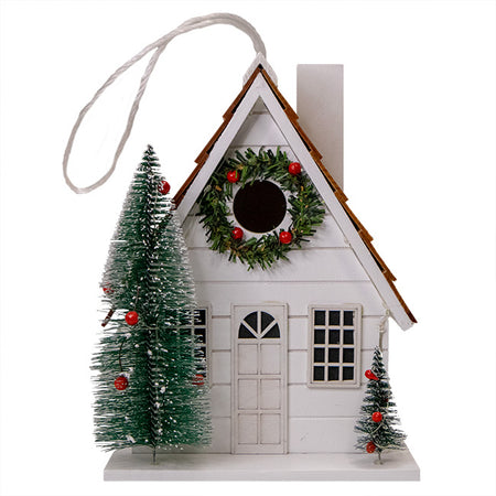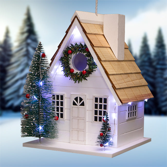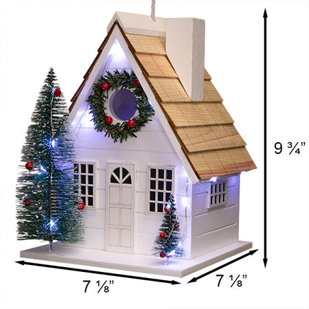 Invite a bevy of songbirds to reside in a holiday wonderland when you place this Home Bazaar Christmas Chateau Bird House with LEDs in your backyard garden. The classic design of this seasonal favorite will instill your birding sanctuary with yuletide cheer and dazzling light, brightening your yard for all to see while beckoning various songbirds to a cozy shelter. This handsome, country style home sports a neat, white tone and its pitched roof features natural, wood shingles to add rustic allure. Faux, white frosted trees adorn the front of the home, resting on the ample, 7.125" square base for a dash of seasonal cheer, and a faux wreath surrounds the 1.25" diameter entrance hole on the front of the dwelling, situated just below the roof. Red imitation bulbs are mixed throughout the trees and wreath to further the holiday motif, and faux windows populate both the front and sides of this quaint, bright abode. The gorgeous and durable wooden chateau lends a classic roosting spot to chickadees, wrens, or other small birds, who can easily access the nesting chamber by way of the entry hole. A white, imitation chimney rests on the right side of the roof to complete the theme, and a convenient panel on the back of the home can be removed with ease to let you carry out nest checks and cleanings. Within this back section rests a plastic battery compartment, which accommodates three AA batteries (not included), and has a helpful switch to let you turn on the LEDs for a vibrant, seasonal showcase. Alternatively, set the integrated timer and let the attractive, white toned LEDs automatically illuminate for 6 hours while remaining dark for 18. A pair of drainage holes are situated on the home's base to let water adequately escape, ensuring a fresh interior. An attached, fabric cord lets you hang this beautiful, illuminative piece, or you may affix a mounting plate (not included) to the base for pole or post mounting. Celebrate the Christmas season in bright and pristine style with the Christmas Chateau Bird House with LEDs.