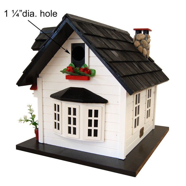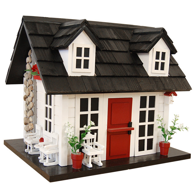 Showcase New England charm while providing shelter to songbirds by placing this Home Bazaar Connecticut Retreat Bird House in your garden. Realistic detailing on each side of this wooden shelter enhances your setting in moments, while the black roof and base contrast the white body. Several faux windows throughout the roost, including a bay style one on one side, bring a bright effect to it, and a red door with matching flower pots offers a spot of color. Fabric flowers, white rocking chairs, a stone covered chimney, and even a miniature bird house complete the adorable unit. A black, shingled and pitched roof covers the interior chamber, and a 1.25" diameter entry allows birds passage. A ladder beneath this entry helps fledglings reach this opening when ready to fly, while drainage holes on the base aid in keeping the nest dry. The rectangular, wooden base wonderfully supports the shelter, and the back of the home unscrews for seasonal nest checks. Rest this unit on a level surface in your garden, or use a mounting bracket (not included) to post mount the piece. Its wooden construction creates a sturdy unit, while its white, black, and red color scheme adds a striking look to your area. Bring a bit of northern style to your bird garden using this Connecticut Retreat Bird House.