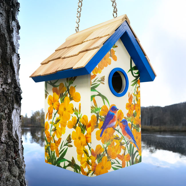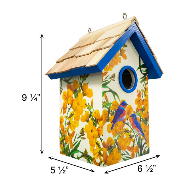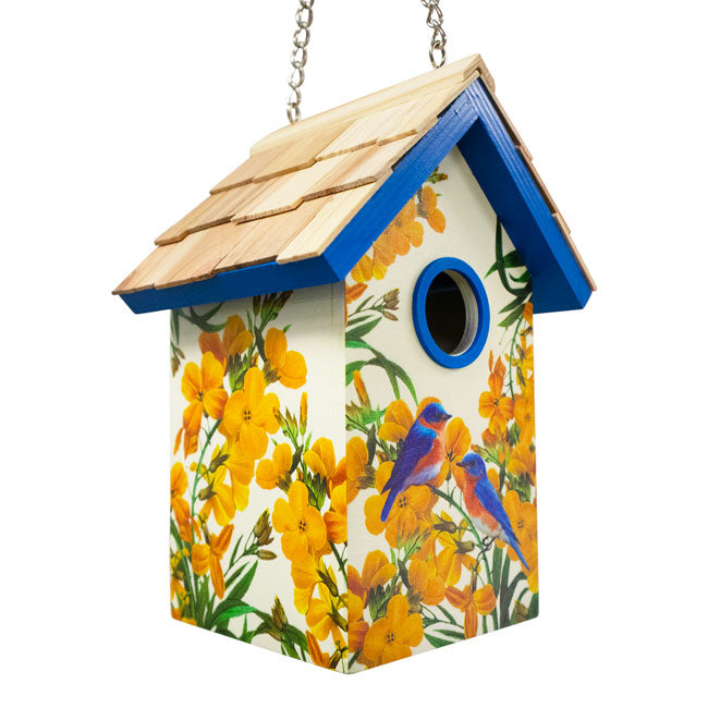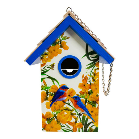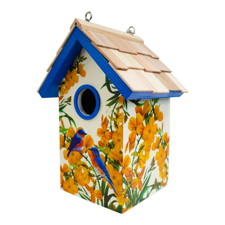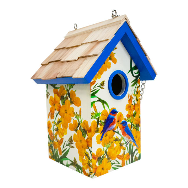 Place a friendly and charming shelter in your bird garden when you showcase this Home Bazaar Bluebirds and Camellia Print Cottage Bird House in it.