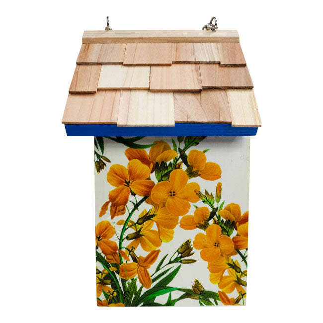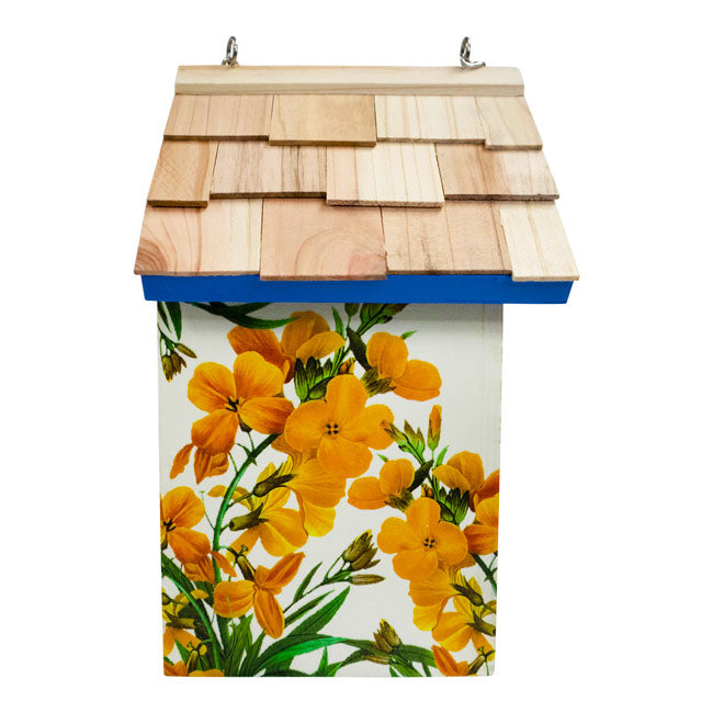 - Large, printed camellia flowers in bloom adorn 3 sides of the home, with a pair of bluebirds on the front panel adding both style and contrast