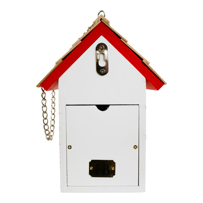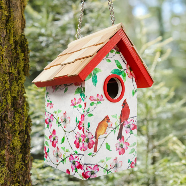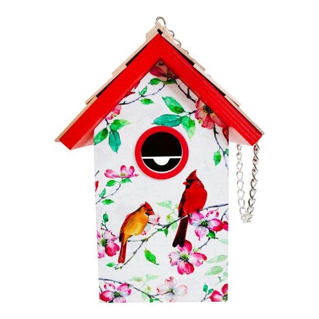 - Bright red tones of the roof trim, entry hole frame, and printed cardinals are sure to add style to a flowerbed or bird garden