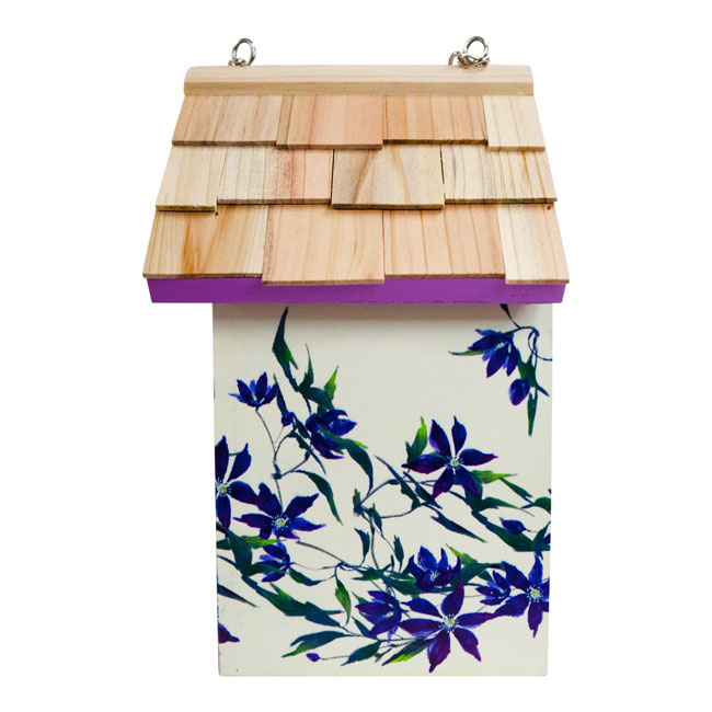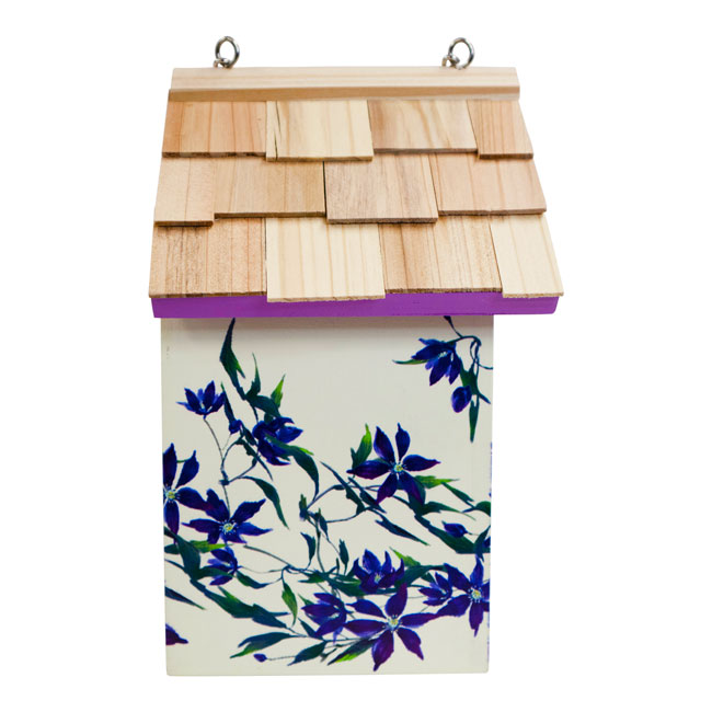 - Tall, rectangular wooden bird house with deep purple, clematis flower print on three sides