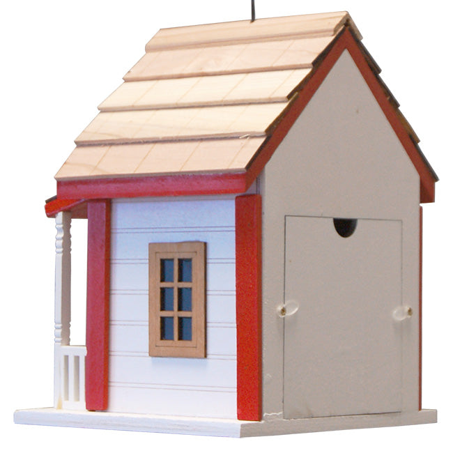 Elevate the style of your bird garden by placing this Home Bazaar Country Charm Cottage Bird House in it. The intricate details and bright colors on this shelter are sure to capture attention, while the size of the unit is perfect for small songbirds to use. Impressed, horizontal lines throughout the white, wooden frame evoke siding, and red trim on the corners, beneath the roof, and around the top, faux gothic window offer contrast. A pitched, lapped roof tops this adorable home, and matching wood on the porch roof furthers the classic architecture. Brown trim on the window and door shapes enhances the roof, and two black, wooden sconce shapes complete the item. Birds enter the piece through the top, pointed arch opening for a secure nesting spot. Ventilation gaps beneath the roof edges prevent birds from overheating, and a drainage hole on the base helps the nest remain dry. Remove the back panel to check the nestlings or clean the item at the end of the season. A cable through the top of the roof peak makes the home easy to hang, and the white and red tones offer a bright look to any setting. Allow this Country Charm Cottage Bird House to provide a rustic and beautiful home to your favorite songbirds.