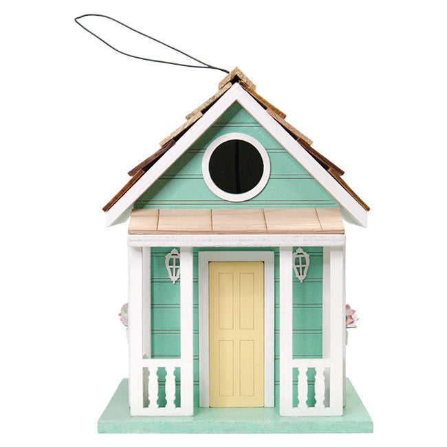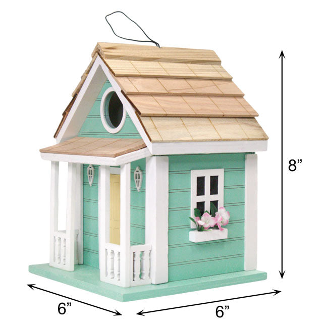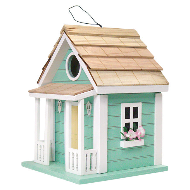 Highlight your bird garden's bold and vibrant allure while drawing nearby songbirds with this Home Bazaar Aqua Country Charmer Bird House. The detailed and realistic design of the house, along with the shelter's bright and pleasing tones, create a fetching focal point for feathered friends, while the item's size is ideal for small songbirds. Impressed, horizontal lines provide visual interest and allure to the wooden, aqua-toned frame as they evoke realistic siding, while white trim offers contrast on the corners, beneath the roof, and around the 1.25" diameter entry. A pitched roof sports wooden shingles and covers the appealing home with natural charm, and faux, pink flowers fill the containers below each side window for a vivid dose of floral beauty, while a yellow, faux door lends soft and delicate contrast to the front of the quaint house. Ventilation gaps below each side of the roof keep the cavity from becoming overheated, while a drainage hole on the dwelling's base provides a clean and reliable roost for feathered friends. The home's rear panel can be removed easily for nest checks and routine cleanings at the conclusion of each season. A simple and handy black cable through the top of the roof's natural shingles allows you to hang this domicile with ease. For an alternative showcase, attach the item to a 4 x 4 post with a mounting bracket (not included), creating an elevated and vivid focal point among your busy bird garden. Beckon lovely birds to a striking and luxurious haven in your outdoor space and provide adequate comfort as they nest with this Aqua Country Charmer Bird House.
