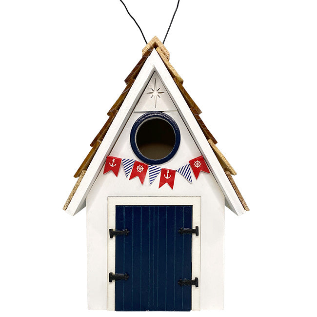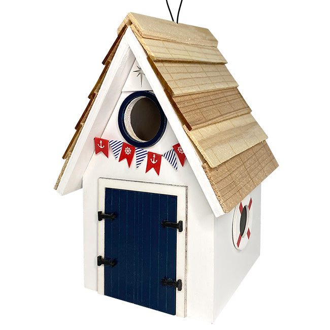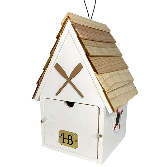 Infuse your backyard or garden with seaside appeal using the Home Bazaar White Dockside Cabin Bird House. This avian home mimics a shoreline cabin and is painted in a flat white and trimmed throughout with navy blue. Its wood shingled roof complements the color scheme of the house, creating the aesthetic of life on the docks, and in its center is affixed a black metal wire loop for simple hanging. Round imitation windows adorn both sides of the home and their circular trim is painted white with red stripes to resemble life preservers. The front contains an imitation double door and a 1.25" diameter bird entrance sitting above the doors and beneath the home's gabled roof. Decorating this section are a patterned banner hanging above the door and an engraved nautical compass star ornamenting the pinnacle of the gable. The backside of the structure contains a decoration made up of two crossed tan oars and is planted just above a 3.75" x 3.5" panel which removes for routine cleaning. A mesh ladder scales the inside of the front wall up to the entrance for easier access for nestlings. A hole sits in the center of the base for proper drainage of accumulated moisture, and gaps between the sidewalls and the roof make for adequate ventilation of the space, creating a comfortable roost for local birds to enjoy. Add a touch of coastal living to your yard with this White Dockside Cabin Bird House.