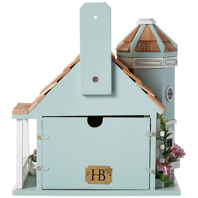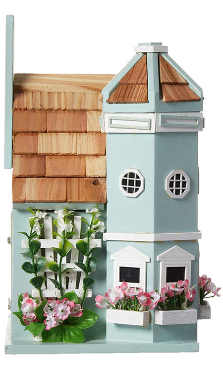 Offer songbirds a deluxe new roost with the Home Bazaar Blue Flower Pot Cottage Bird House. Reminiscent of homes on the eastern seaboard, this detailed unit will certainly bring a dramatic hint to any setting. A side turret and wraparound porch capture the classic theme, while the soft blue color enhances the seaside motif. Faux windows along the turret and bottom floor, along with wooden shingles on each roof, further the realistic look. Fabric flowers on the trellis, within the window boxes, and in the hanging basket create a cheerful façade, and white trim on the windows, door, and porch rail complete the piece. A 1.25" diameter opening allows birds access to the home, and a white octagon surrounds it for extra visibility. This opening leads to the spacious interior, enabling birds to make a cozy nest. Drainage holes on the base help the nest stay dry, while ventilation gaps under the roof overhang aid in regulating the interior temperature. Screening beneath the entry hole forms a ladder, assisting fledglings in exiting the roost. Remove the back panel to clean the unit and for seasonal nest checks, ensuring the home stays lovely for your feathered friends. The attached hanging tab allows you to place the roost against a wall, post, tree, or fence with ease, while its flat base enables it to rest on any level surface. Crafted from wood and painted light blue, this home will certainly accent your landscaping for several seasons. Celebrate classic design in your bird garden with this Blue Flower Pot Cottage Bird House.