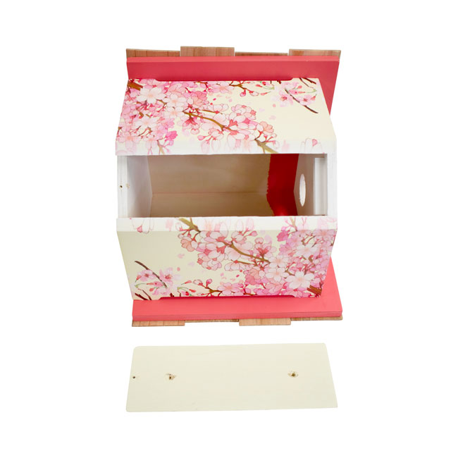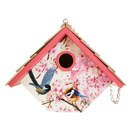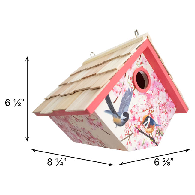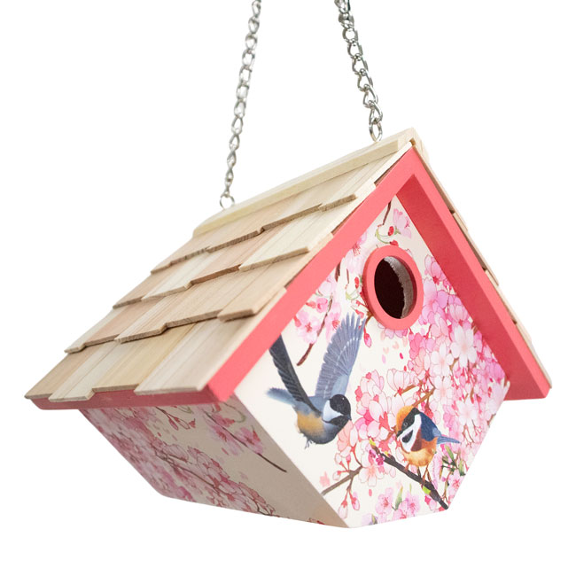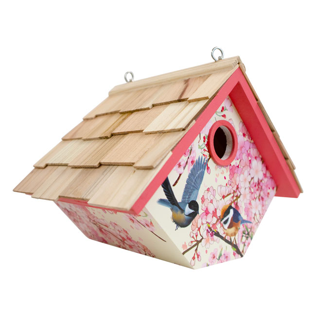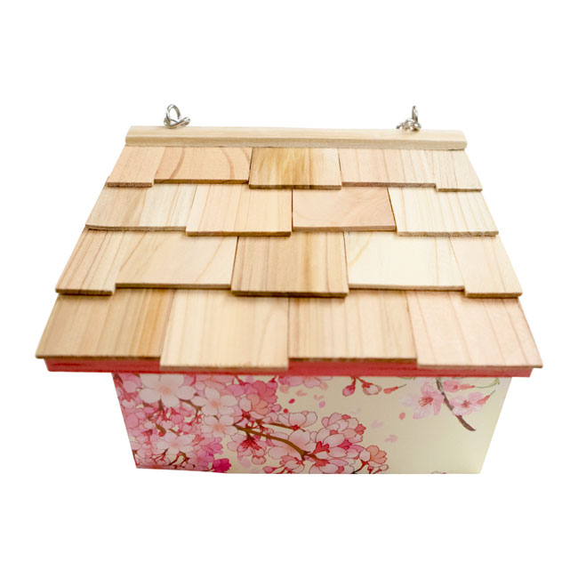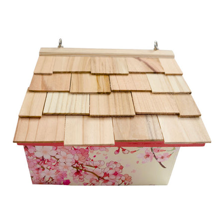 - Realistic print of cherry blossoms in bloom adorn three sides of this wooden shelter, enhanced by pink trim on the roof line and around the entry hole