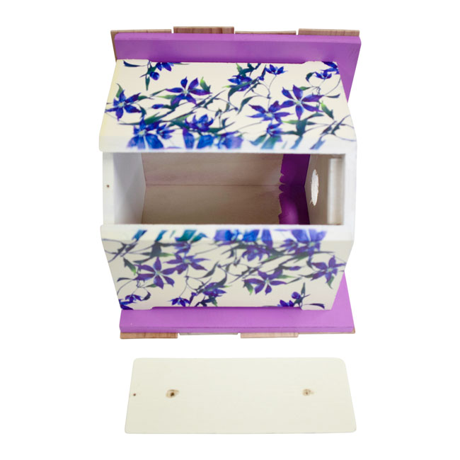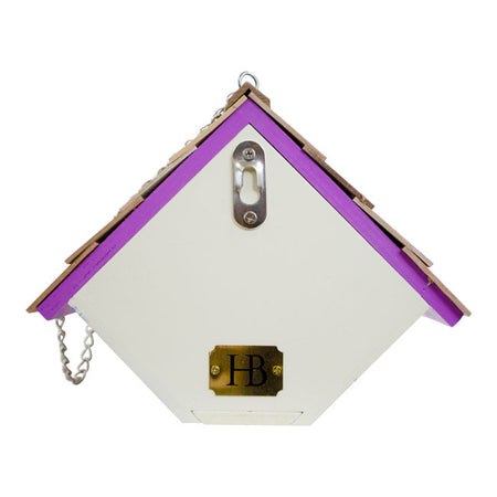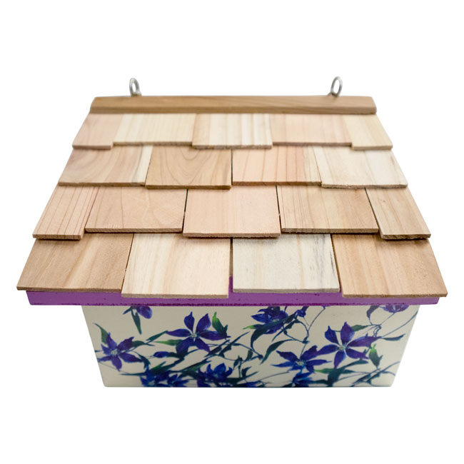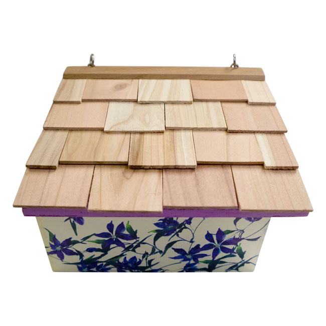 - Pitched, pine shingled roof with slight overhang keeps the nesting chamber dry, assisted by two drainage holes on the flat base