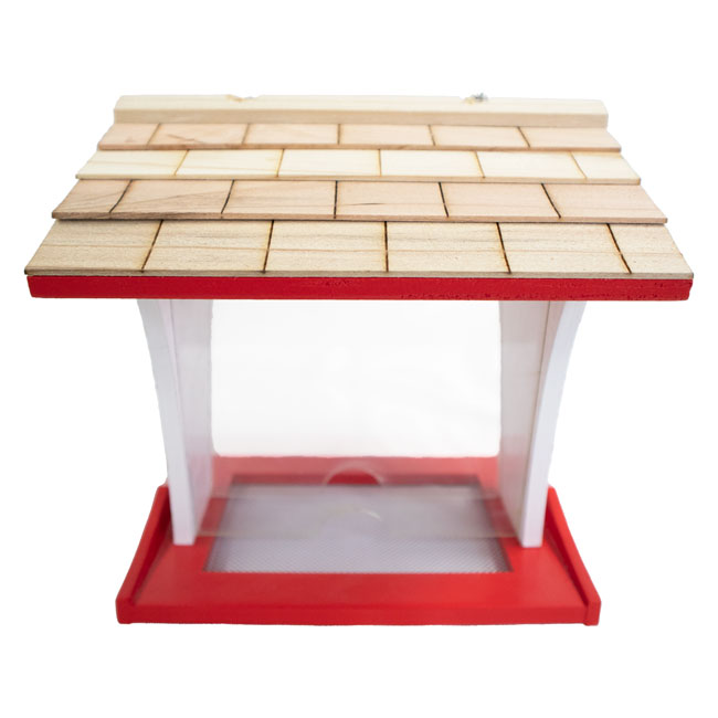 - Pitched, pine shingled roof fully covers the feeder reservoir, keeping seed dry