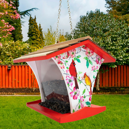 Bring the timeless allure of cardinals into focus in your bird sanctuary with this Home Bazaar Cardinals and Dogwood Print Happy Hopper Bird Feeder.