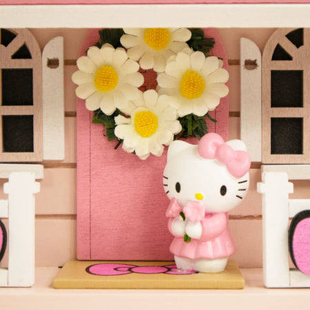 - Hello Kitty figure stands in the doorway, with her familiar, pink ribbon on the doormat.