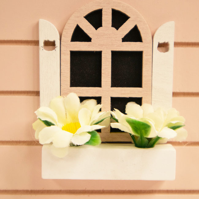 - Faux flowers rest on the front door and in flower baskets below each side window