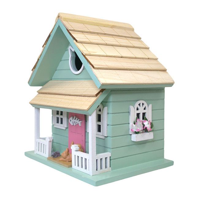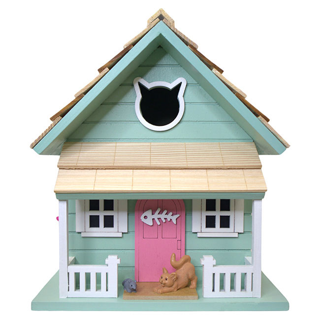 - Bright, pastel green home showcases your love of kittens while welcoming birds to the garden