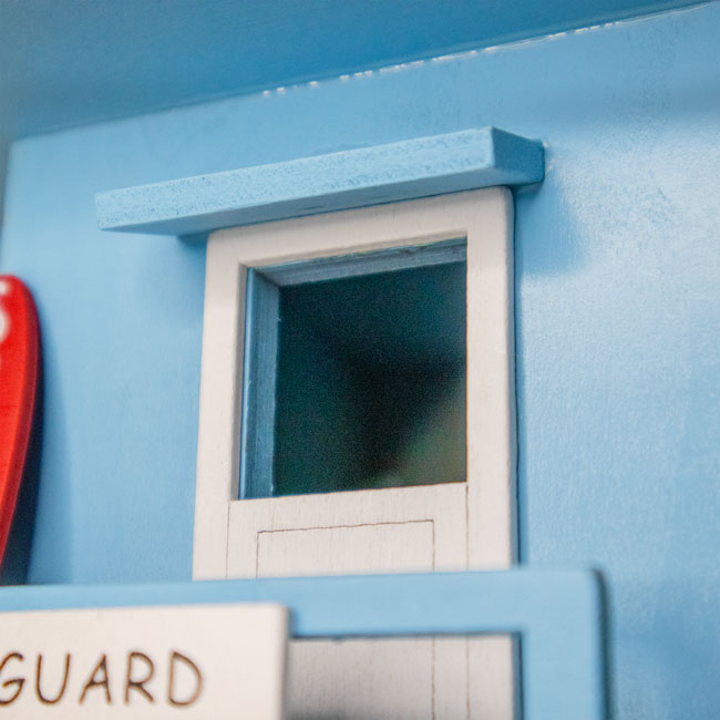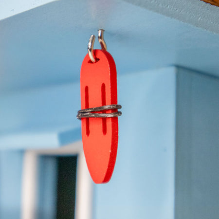- A miniature red surfboard, rescue float, and white marker reading "Lifeguard on Duty" lends seaside charm to this item