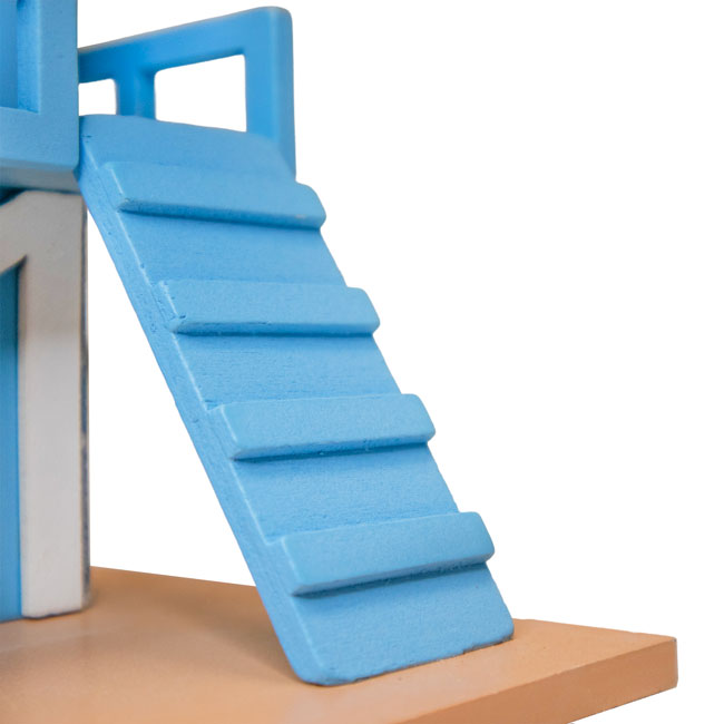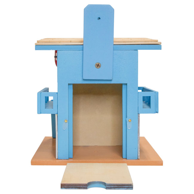- A small ramp, elevated walkway with railing, and flat roof lend realistic architecture to this nest box