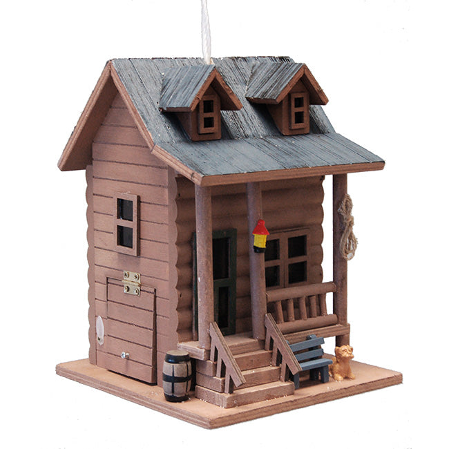 Create a homestead just for your feathered friends by adding this Home Bazaar Log Cabin Bird House to your backyard. The striking detailing, familiar shape, and classic colors throughout this home are sure to form a rustic theme in your yard, while offering an avian family a comfortable roosting spot. Varied gray tones on the steeply pitched roof evoke slate, and contrast the brown of the rest of the shelter. Two dormer window shapes on this roof showcase its height, and a rope hanger at its peak allows the item to be placed on a branch. A 1.25" diameter entry hole beneath the roof peak enables chickadees, nuthatches, or wrens to enter the unit, while a small door at the base of the opposing side allows you to clean the home at the end of each season. Two small holes on the base of the unit help drain any captured water, and a gap beneath the roof overhang aids in ventilating the shelter. The wooden construction enhances the rustic appeal, and the log shapes on the front and back of the home sport rounded facades for even more dimension. Three wooden porch columns not only support the roof overhang; they also showcase a faux lantern, rope, and railing. A bench and barrel rest near the stairs, and a dog figure brings whimsy to the piece. The item is fantastic for showcasing the joys of cabin living, and its brown hues enhance your landscaping. Offer birds their own rustic retreat by placing this Log Cabin Bird House in your backyard.
