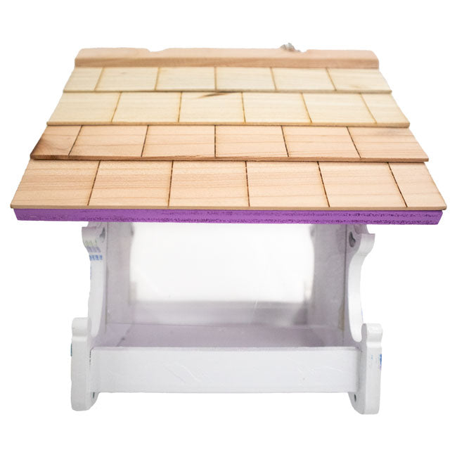 - Sturdy, unadorned roof sports shingles and keeps the feeding chamber dry and fresh as birds feast