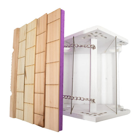 - Clear plastic panels rest on either side of the wood, forming a reservoir which can hold nearly a quart of seed