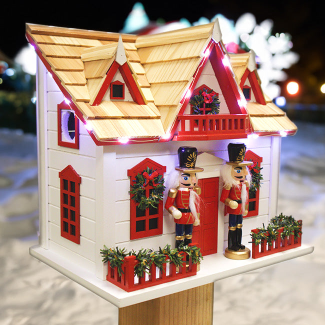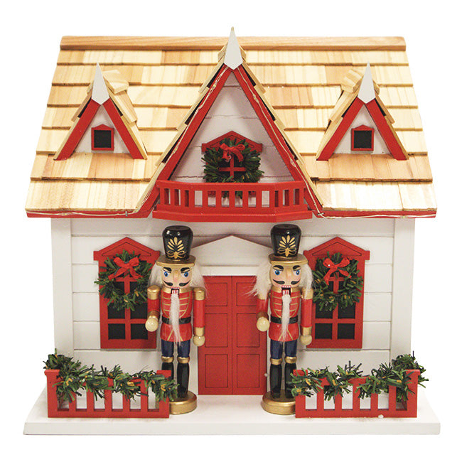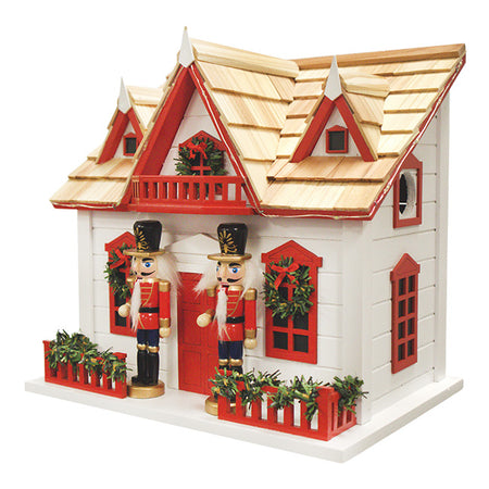 Transform your yard into a exclusive, illuminative display of yuletide cheer and welcome birds to the garden with this Home Bazaar Nutcracker Bird House with LEDs. This expansive, uniquely designed, white and red dwelling will serve as a dramatic and bright focal point in your bird sanctuary, while lending an all new homage to the wonder and whimsy of the holiday season. Eye-catching window frames, fencing, and an attention grabbing door populate the front of this quintessential home, providing ample color while festooning this domicile with seasonal allure. Green, fabric wreaths and holly accentuate the faux windows and fencing, while adding a dash of contrasting green to the home's coloration, and a pair of detailed nutcrackers stand guard on either side of the front door. These one-of-a-kind sentries each stand 5" tall and sport black and gold top hats to go with their faux white hair and beards. Each of these nutcracker's outfits sports additional gold, red, black, and blue tones for a regal flair while they serve as faithful, seasonal symbols. A small balcony emerges from the rustic, gabled roof, for an extra addition of yuletide opulence. Wood shingles cover this generous roof to protect the house with natural, unembellished charm, and white LEDs running along the roof line instill visual intrigue and brightness to the holiday home, expertly accentuating the colorful palette. A 1.25" diameter opening sits on each side of this large abode, just below the roof, creating dual nesting chambers for your feathered friends, and a screen ladder on each interior side wall rests just below the entrance to encourage nestlings to climb out of the abode with ease. A drainage hole on the shelter's generous base ensures the nests remain dry and fresh, while the unit's expansive back panel can be removed with ease for cleanings and nest checks. Within this back section rests a plastic battery compartment inside a wooden frame. This plastic compartment accommodates three AA batteries (not included), and sports a handy switch letting you turn on the LEDs for a dazzling, seasonal display. Alternatively, set the integrated timer and let the LEDs automatically illuminate for 6 hours while remaining dark for 18. The small boards provide a lovely barrier between the battery compartment and visiting birds, with the plastic casement adding weather resistance. A rear mounting paddle sports a predrilled hole and swings upward easily to let you place this seasonal showcase against a wall, post, or fence. For a different type of display, the large base may accommodate a mounting plate (not included) to allow for placement on a pole or post. The striking home's wooden construction features a finish using water based paints, ensuring this lovely, holiday homage will remain fashionable and reliable throughout multiple, celebratory seasons of service. Light up your holly and jolly bird sanctuary and welcome all feathered friends with the unique, outstanding Nutcracker Bird House with LEDs.