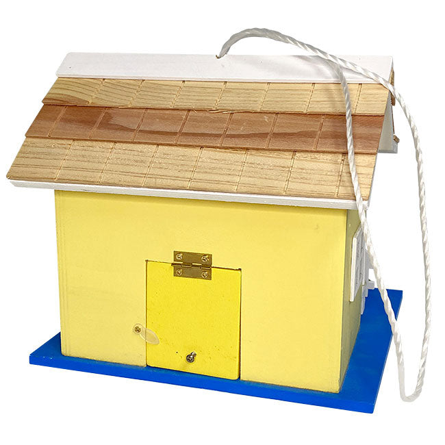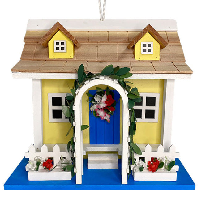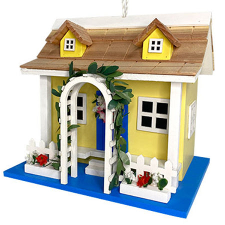 Establish a luxurious retreat for local birds by placing the Home Bazaar Park Villa Bird House in your garden. Light yellow and bright blue hues with white trim bring a coastal aesthetic to your yard while faux primroses and red and white flowers decorate imitation flower boxes and a wreath on the front door. A pitched, shingled roof with two front dormers, as well as a slanted porch roof and two supporting columns, add an architectural element to the house, enhanced by picket fencing and an arbor covered in faux ivy leaves. A 1.25" diameter entry sits on one side of the abode above one of the house's four imitation windows. The spacious interior provides plenty of room for a wren or chickadee nest and can be accessed through a 2.375" x 2.75" panel for cleaning. One drainage hole sits in the center of the base of this roost for carefree draining while a white rope is affixed to the center of the pitched roof for straightforward hanging. This house can also be mounted atop a post by attaching it to a mounting plate (not included) for a more sturdy display. The intricate design of the home's exterior will certainly capture attention while its wooden construction maintains a natural hint. Offer your backyard birds shelter and comfort in villa style using this Park Villa Bird House.