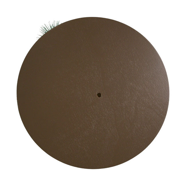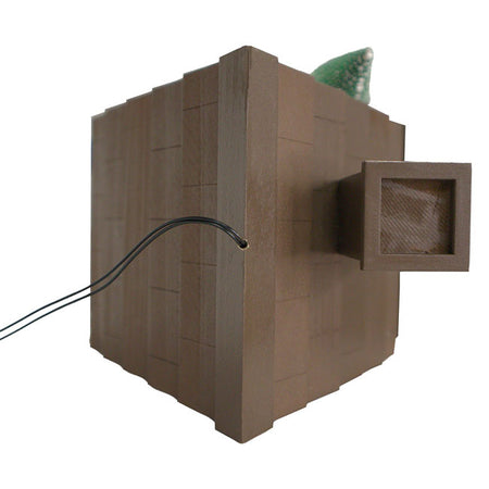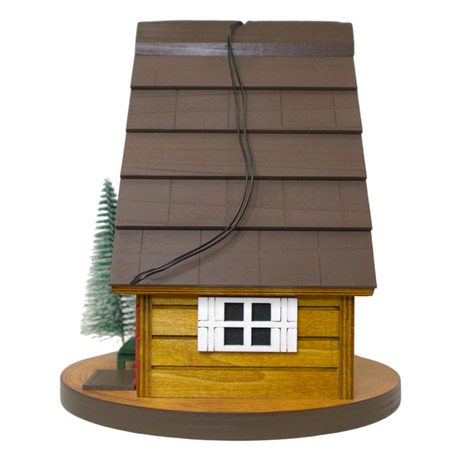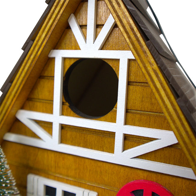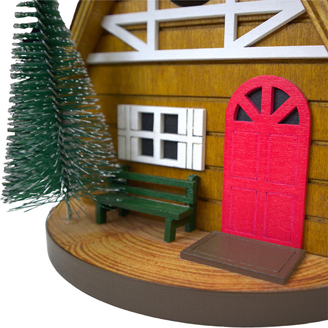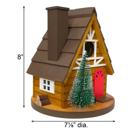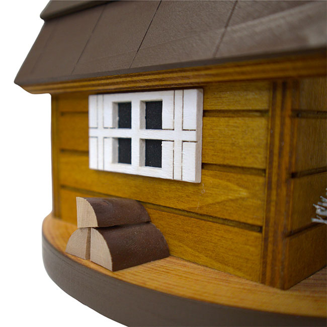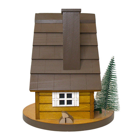 - A lighter tan body sports horizontal lines to mimic a log cabin, and the structure rests on a 7.125" diameter base painted to look like a wooden disc